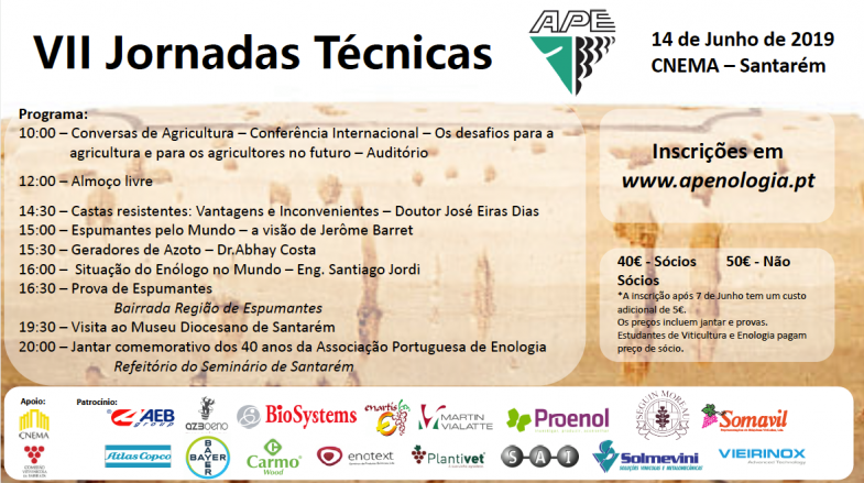 A Associação Portuguesa de Enologia vai realizar as suas VII JORNADAS TÉCNICAS, no próximo dia 14 de Junho de 2019, nas instalações do CNEMA, durante a Feira Nacional de Agricultura em Santarém. Uma forma de dinamizar a formação e o convívio dos seus associados e elementos da fileira vitivinícola em geral. O evento contará com apresentações técnicas na área da Enologia e Viticultura e uma prova comentada de vinhos espumantes da Bairrada. A Solmevini é uma das patrocinadoras.